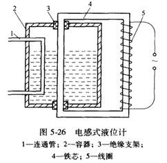 圖5-26為根據(jù)線圈感抗連續(xù)測(cè)星導(dǎo)電液體液位的一種方法。用連通管將被測(cè)導(dǎo)電液體引至容器,此容器中央有鐵芯穿過(guò),鐵芯上繞有線圈。交流電流通過(guò)線圈時(shí)有感抗作用,容器內(nèi)無(wú)導(dǎo)電液體時(shí)感抗最大。液位升高,則渦流加大,相當(dāng)于變壓器副邊接近短路,這時(shí)原邊感抗就越來(lái)越小,原邊電流就逐漸加大。只要在線圈上通以電壓和頻率恒定的交流電,便可根據(jù)電流的大小判斷液位。必須指出,容器壁應(yīng)為絕緣材料。否則容器壁的短路作用將使靈敏度下降。
