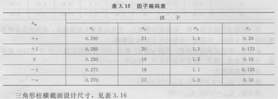 三角柱的截面[圖3.28 (b)]有4個(gè)幾何參數(shù)。如果每個(gè)參數(shù)取3個(gè)水平,則有34=81種組合;如取4個(gè)水平,則有44 =256種組合??紤]到采用回歸分析方法得出數(shù)學(xué)模型時(shí),還有各種參數(shù)的交互作用,回歸系數(shù)一般不止4個(gè)。所以如果不采用最優(yōu)化試驗(yàn)設(shè)計(jì),加工樣品的數(shù)量及試驗(yàn)次數(shù)都是巨大的,試驗(yàn)時(shí)間和經(jīng)費(fèi)相當(dāng)可觀。為此,采用兩種優(yōu)化設(shè)計(jì),即二次回歸通用設(shè)計(jì)和一般正交設(shè)計(jì)。