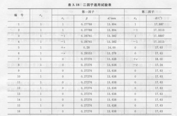 (1)二次回歸通用設(shè)計(jì) 通用組合設(shè)計(jì)是由旋轉(zhuǎn)組合設(shè)計(jì)變化來的,它能保證"與試驗(yàn)中心點(diǎn)距離相等,球面上各回歸方程預(yù)測(cè)值的方差相等飛而通用性則保證在區(qū)間內(nèi),預(yù)測(cè)方差基本保持一個(gè)常數(shù)。