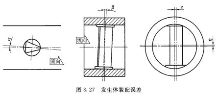 (1)偏角度偏角是發(fā)生體流動(dòng)方向的軸線與測(cè)量管軸線間的夾角,如圖3. 29所示。如果發(fā)生體安裝時(shí)存在偏角,這實(shí)際上是改變了發(fā)生體的形狀和尺寸。