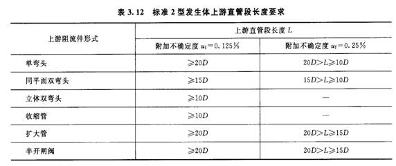 式(3. 28)中還包括上游直管段長(zhǎng)度的附加不確定度。表3.11和表3. 12中分別列出了標(biāo)準(zhǔn)1型和標(biāo)準(zhǔn)2型發(fā)生體所要求的上游直管段長(zhǎng)度及附加不確定度。從表中可看出附加不確定度u£減小,所要求的直管段應(yīng)增加。