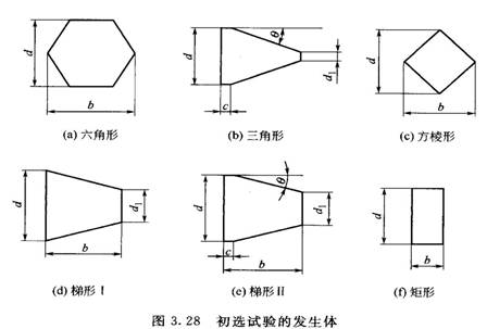 開始階段對(duì)圖3.28所示的六種形狀發(fā)生體進(jìn)行初選試驗(yàn)??煽闯鰣D中(a)六角形和( c)方棱形都只有1個(gè)尺寸變量;矩形(f)有兩個(gè)尺寸變量;梯形I(d)有3個(gè)尺寸變量;三角形(b)和梯形II (e)各有4個(gè)尺寸變量。尺寸變量不同,試驗(yàn)工作量差異很大。