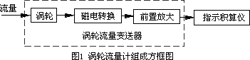 如圖1所示,氣體渦輪流量計主要由渦輪流量變送器和指示積算儀組成[1]。渦輪流量變送器把流量信號轉(zhuǎn)換成電信號,由指示積算儀顯示被測介質(zhì)的體積流量和流體總量。