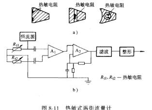 采用對流速敏感的熱敏元件,通過測量因旋渦分離引起的流速變化來反映旋渦分離頻率。把自熱式熱敏電阻置于旋渦發(fā)生體底部或適當(dāng)部位(見圖8-11),旋渦分離引起局部流速脈動,使阻值變化。一般采用負溫度系數(shù)的熱敏電阻,采用恒流電路進行檢測。電路把阻值變化轉(zhuǎn)換為交變電壓信號,經(jīng)差動放大、濾波、整形輸出渦街脈沖信號。這種儀表檢測靈敏度高,下限流速較低,對管道振動不敏感,但工作溫度上限不高,多用于清潔、無腐蝕介質(zhì)的流量測量。