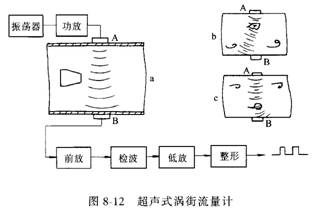 如圖8-12所示,在旋渦發(fā)生體下游對稱安裝超聲波發(fā)射換能器及接收換能器,發(fā)射換能器將等幅連續(xù)的聲波發(fā)射到流體中去,聲波橫穿流體傳播,當(dāng)聲波通過旋渦時,引起聲束偏轉(zhuǎn),每一對旋轉(zhuǎn)方向相反的旋渦對聲波產(chǎn)生一個周期性的變化。經(jīng)接收探頭轉(zhuǎn)換成電信號,經(jīng)電路放大、檢波、整形后獲得旋渦信號。這種儀表具有非接觸測量的優(yōu)點且具有較高的檢測靈敏度,下限流量較低。但由于溫度對聲調(diào)制有影響,流場的變化和液體中所含的氣泡對測量的影響也很明顯,所以該儀表一般只用于溫度變化較小的氣體和含氣量很小的液體流量測量。