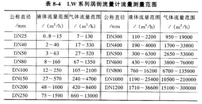 如果取氣體最小流速umin=3.7m/s,最大流速umax=75m/s;液體最小流速umin=O.42m/s,最大流速umax=9.Om/s,則渦街流量計的流量測量范圍如表8-4所示。