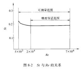 式中,u1是旋渦發(fā)生體兩側(cè)平均流速(m/s);d是旋渦發(fā)生體特征寬度(m); St是斯特勞哈爾數(shù)(Strouhal無量綱系數(shù)),斯特勞哈爾數(shù)與旋渦發(fā)生體的形狀及雷諾數(shù)有關(guān),圖8-2所示為圓柱形旋渦發(fā)生體的斯特勞哈爾數(shù)與雷諾數(shù)之間的關(guān)系圖,由圖8-2可知,當(dāng)雷諾數(shù)Re在2′ 104-7′ 106的范圍St基本是一個常數(shù),m是旋渦發(fā)生體兩側(cè)弓形面積與管道內(nèi)橫截面積之比對于直徑為d的圓柱形旋渦發(fā)生體