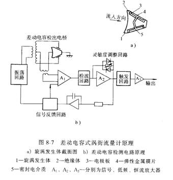 在旋渦發(fā)生體兩側(cè)面(或旋渦發(fā)生體外部)設(shè)置差動電容傳感器,其結(jié)構(gòu)原理如圖8-7a。兩個電容中間密封的電介質(zhì)一般為硅油,電介質(zhì)在內(nèi)部是連通的。兩個外極板中間充滿硅油可以提高差壓測量的敏感性,可減小靜壓誤差。在脈動差壓作用下,電容值的變化是差動的。兩電容接成差動電容電橋,經(jīng)信號處理電路轉(zhuǎn)換成與旋渦頻率相應(yīng)的脈沖信號或電流信號,如圖8-7b所示。近年來,電容式渦街流量計得到了迅速的發(fā)展,在測量范圍、工作溫度范圍和抗振性能等方面都有明顯改進。如何適應(yīng)臟污介質(zhì)和腐蝕性介質(zhì)是它有待改進的問題。