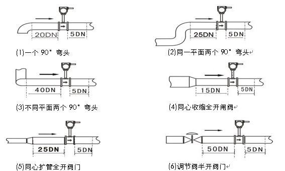 1、渦街流量計(jì)安裝點(diǎn)的上下游直管段必須安裝要求,否則會(huì)影響介質(zhì)在管道中的流暢,影響測(cè)量精度。上下游直管段長(zhǎng)度要求見圖