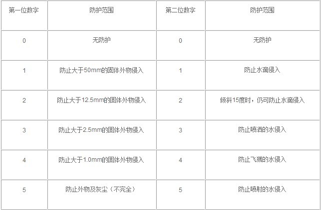 平時(shí)所見的防護(hù)等級(jí)都用IP加兩位數(shù)字來(lái)表示,其中IP為防護(hù)等級(jí)的標(biāo)示,第一位數(shù)字表示含義對(duì)應(yīng)下表: