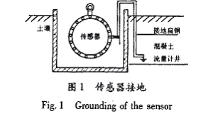傳感器安裝接地直接影響系統(tǒng)抗干擾性能,所用接地線必須防止感應(yīng)到任何其他干擾電壓。因此,不能把接地線與其他帶電電氣設(shè)備的接地連線在一起;接地施工采用就地打接地極方式接地。在流量計(jì)井外側(cè)安裝接地極,采用扁鋼引入流量計(jì)接地點(diǎn)。接地電阻值不大于10 Q,傳感器接地如圖l所示。