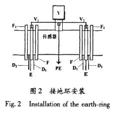 圖2中:V1、V2為專用接地線,由制造廠提供;PE為功能接地線,施工現(xiàn)場(chǎng)采用扁鋼制作。D1、D2為密封墊片;E為接地環(huán);F1為管道法蘭;F為傳感器法蘭;Y為傳感器信號(hào)輸出端。