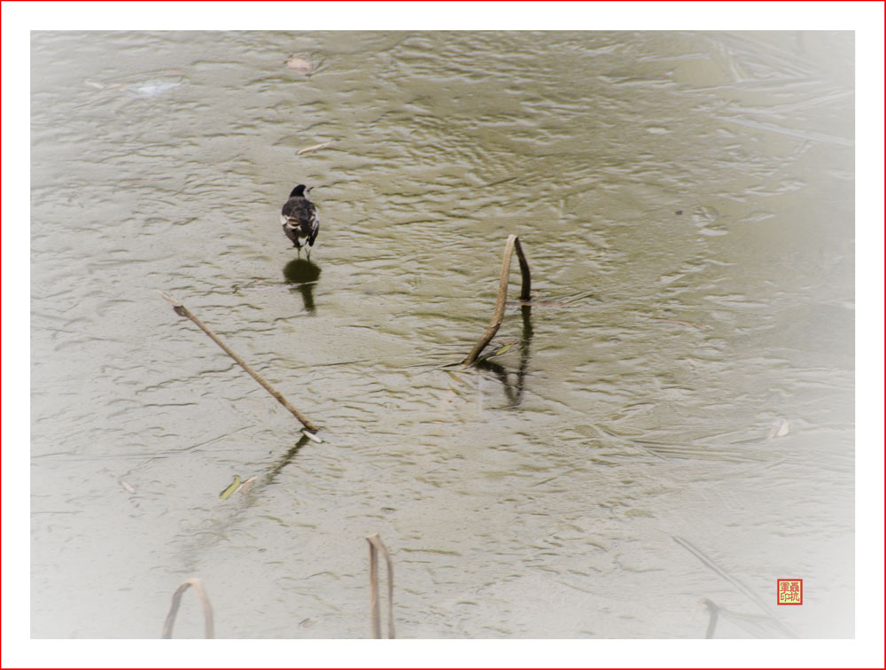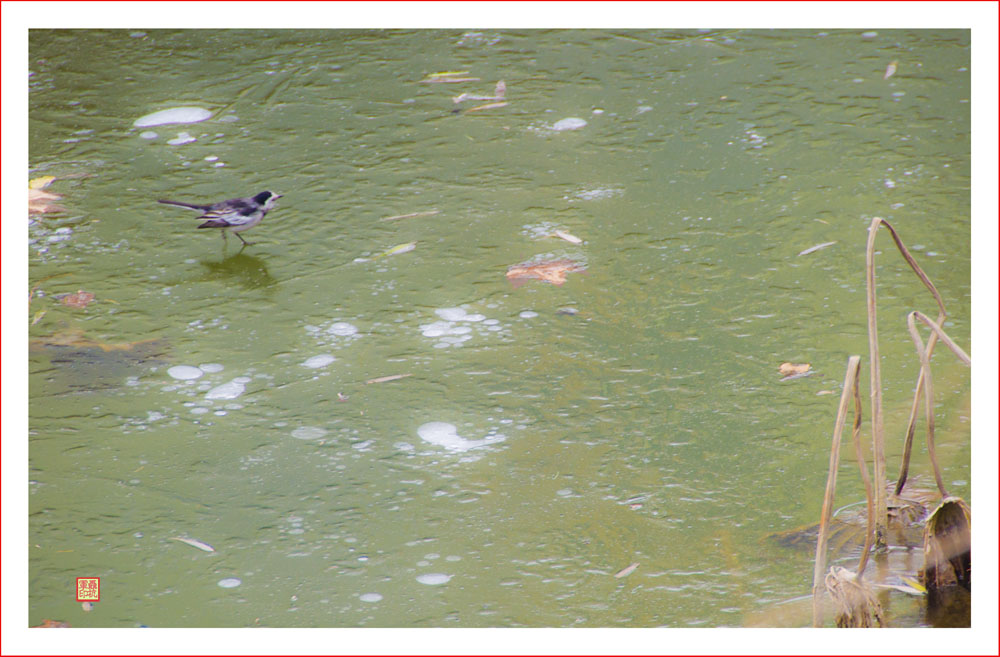 < 荷花蕩殘荷與嬉戲的翠鳥