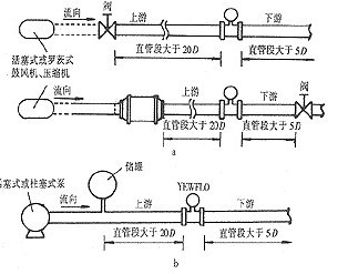 如果是使用活塞式或羅茨式的鼓風(fēng)壓縮機(jī)氣體管道或柱塞式泵的高壓液體管道(約1MPa),流體容易發(fā)生振動,此時,應(yīng)把閥門安裝在流量計上游,最好是在流量計上游裝一個液體減振器;同時應(yīng)考慮在流量計上游安裝儲罐以減少流體振動(見圖2)。